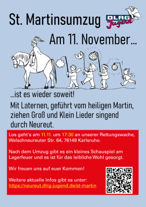 Auch im Jahr 2025 laden wir wieder alle großen und kleinen Gäste zu unserem traditionellen St. Martinsumzug ein. Los geht es wie gewohnt am Dienstag, den 11. November 2025, um 17:30 Uhr an unserer Rettungswache (Welschneureuter Str. 64).